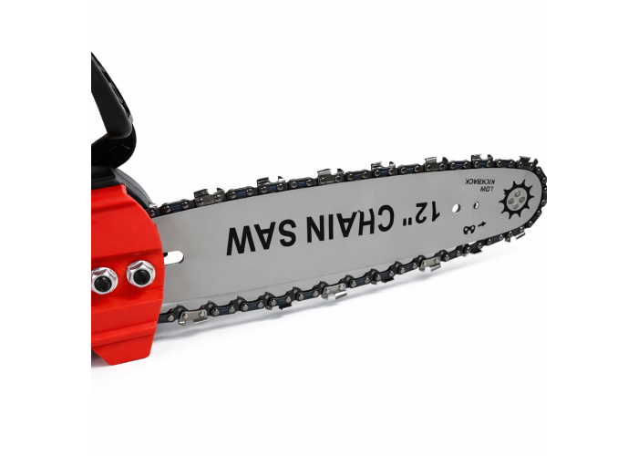 Пила обладнана шиною завдовжки 12 дюймів, що підтверджено маркуванням на напрямній. Ланцюг уже встановлений на шину. Конструкція передбачає захисний кожух над ланцюгом, який знижує ризик контакту з рухомими елементами під час роботи.