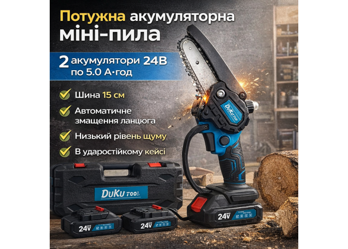 Акумуляторна мініпила на 2 акумулятори з автоматичним змащенням ланцюга та шина 15 см на 2000 Вт DUC2000z