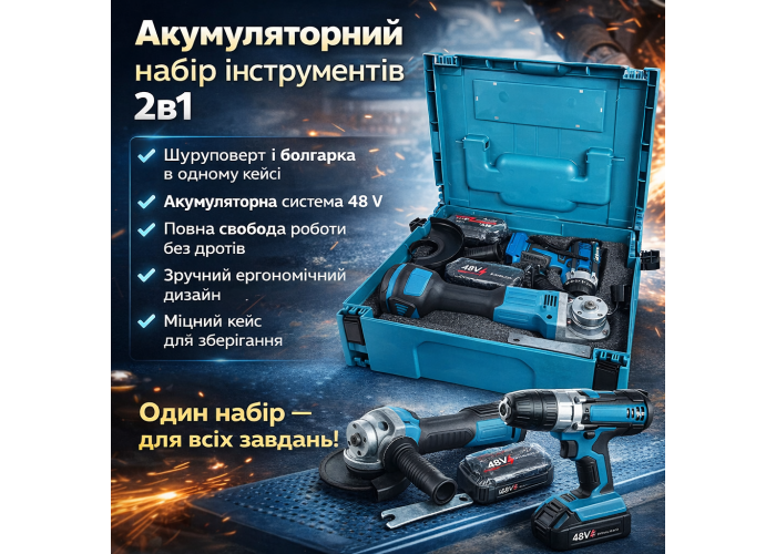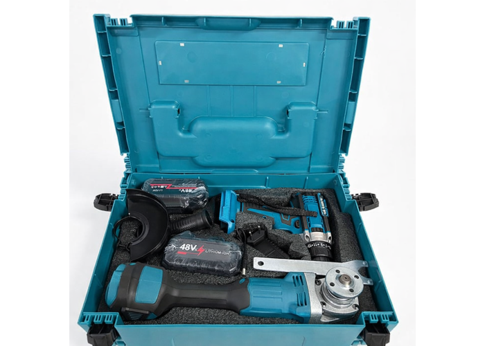 Набір акумуляторного інструменту 2в1 Jitpex — це універсальне рішення для будівельних, монтажних і побутових робіт. До комплекту входить акумуляторний шурупокрут і кутова шліфмашина (болгарка), що працюють від загальної акумуляторної системи 48V, що забезпечує зручність і мобільність без прив'язки до мережі.