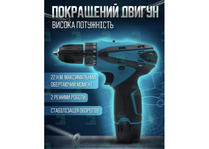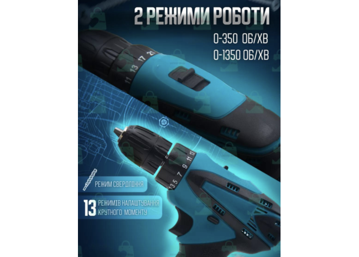 Цей легкий акумуляторний інструмент має реверс. Механічний редуктор на металевих шестернях працює на двох швидкостях. Тут можна працювати у двох режимах. Перший — це режим від нуля до 350 обертів на хвилину, який дає змогу працювати з максимальним крутним моментом як шурупокрут, а також застосовується для свердління, яке вимагає великих зусиль. Другий режим — від нуля до 1300 обертів на хвилину. Його застосовують для того, щоб свердлити тонкі отвори, причому тут застосунок великої сили абсолютно не потрібний.