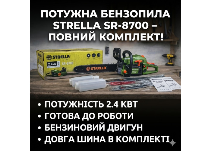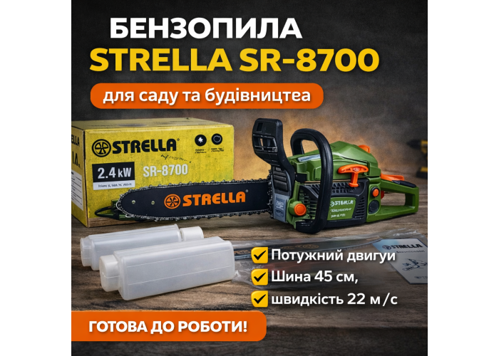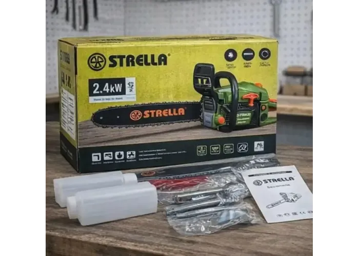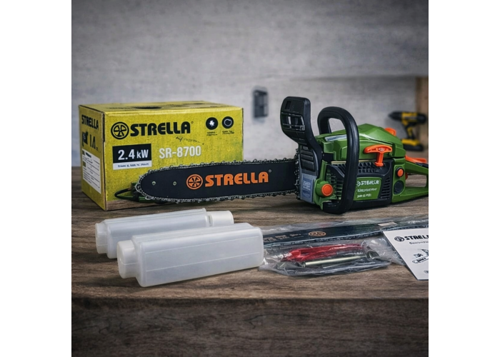 Опис Потужна та надійна бензопила STRELLA 2.4 klv (SR_8700) розроблена для виконання широкого спектра завдань на дачній ділянці, у саду та на будівництві. Інструмент обладнаний продуктивним бензиновим двигуном, який забезпечує високу швидкість розпилювання деревини будь-якої твердості. Завдяки автономності пилка ідеально підходить для роботи в віддалених місцях без доступу до електромережі. Конструкція передбачає зручний хват і збалансований центр ваги, що знижує навантаження на оператора у разі тривалого використання. Міцний корпус захищає внутрішні вузли від пошкоджень. Модель комплектується всім необхідним для швидкого старту роботи, включно з ємністю для приготування паливної суміші.