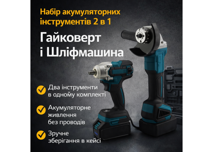 Універсальний набір акумуляторних інструментів 2 в 1 містить кутову шліфувальну машину (болгарку) та гайковерт. Комплект призначений для широкого спектра будівельних, ремонтних і монтажних робіт: від закручування кріпильних елементів до різання та шліфування бетону, каменю або металу. Інструменти постачаються у високоміцному корпусі, що забезпечує зручність зберігання і транспортування.