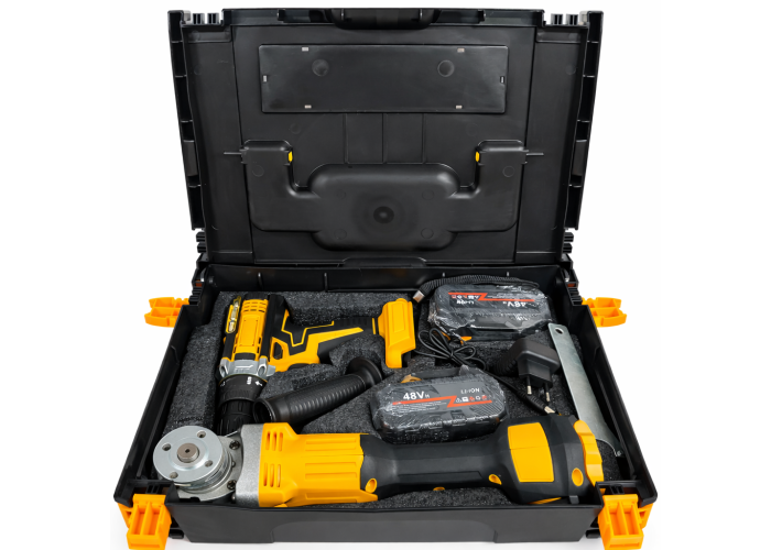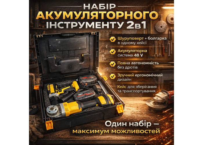 Набір акумуляторного інструменту 2 в 1 Jitpex — це універсальне рішення для будівельних, монтажних і побутових робіт. До комплекту входить акумуляторний шурупокрут і кутова шліфмашина (болгарка), що працюють від загальної акумуляторної системи 48V, що забезпечує зручність і мобільність без прив'язки до мережі.