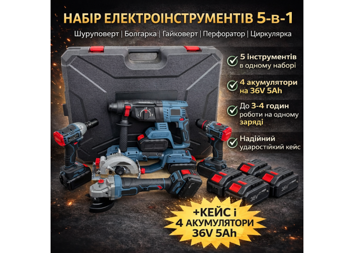 Багатофункційний набір електроінструментів 5-в-1 36V — це професійне рішення для дому, будівництва, ремонту й автосервісу. В одному ударостійкому кейсі ви отримуєте 5 потужних інструментів, сумісних із єдиною акумуляторною платформою 36V.