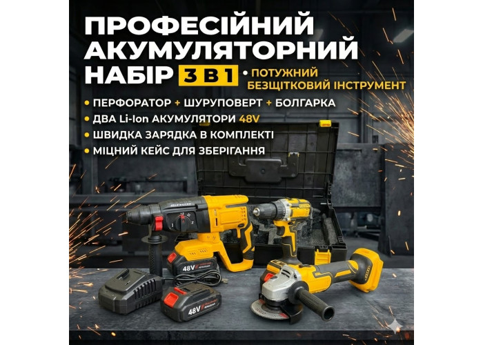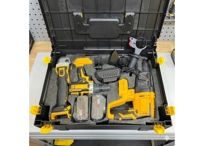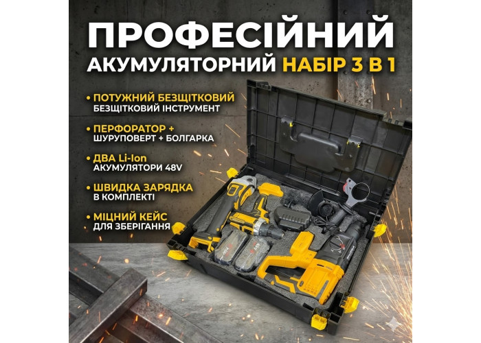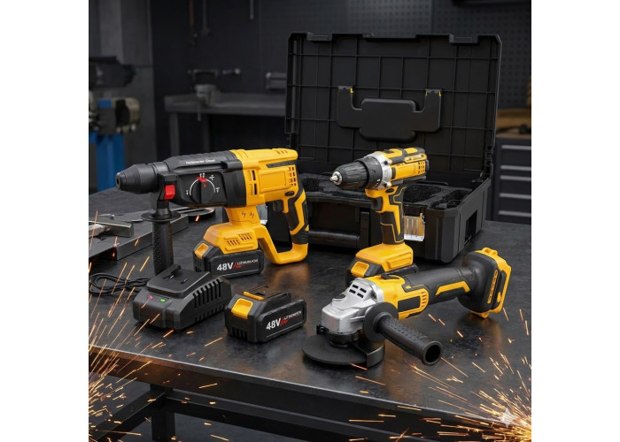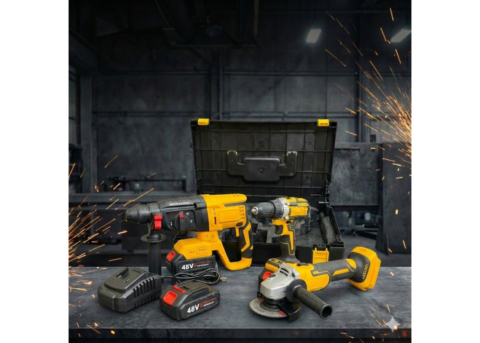 Опис Універсальний акумуляторний набр інструментів 3 в 1 — це потужне рішення для професійних будівельних робіт і побутового використання. До комплекту входять три найпопулярніші інструменти: безщітковий перфоратор, двошвидкісний шурупокрут і високообертовий кутова шліфувальна машина (болгарка). Усі інструменти працюють на єдиній акумуляторній платформі 48 V, що забезпечує повну автономність і мобільність на об'єкті без прив'язки до електромережі. Інструменти вирізняються високою продуктивністю, надійною складкою й ергономічним дизайном із прогумованими вставками для комфортного схоплення. Весь набір постачається в міцному пластиковому кейсі для зручного транспортування та зберігання.