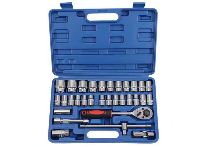 В комплекте — 32 предмета: торцевые и свечные головки, трещотка на 24 зубца, удлинители, карданный шарнир и т.д. Инструменты изготовлены из закаленной стали, устойчивой к коррозии. Эргономичная ручка трещотки обеспечивает комфорт, а магнит в свечных головках – надежную фиксацию.