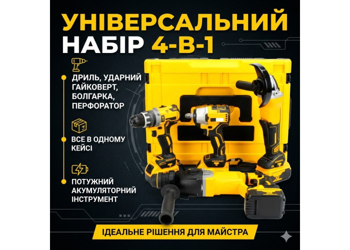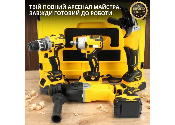Набор аккумуляторного инструмента COMBO SET 4-в-1 36V — это профессиональный комплект, разработанный для выполнения широкого спектра строительных, ремонтных и монтажных работ. В набор входят сразу четыре мощных инструмента: дрель-шуруповёрт, перфоратор, болгарка и гайковёрт.