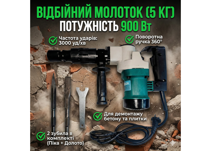 Назначение: Этот отбойный молоток класса "5 кг" — идеальный инструмент для ремонтно-строительных работ средней тяжести. Его главное преимущество – баланс веса и мощности. Он достаточно легкий, чтобы работать горизонтально (сбивать старую плитку, штукатурку, делать штробы в стенах), но имеет достаточную силу удара для разрушения кирпичной кладки и бетонных стяжек.
