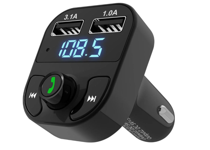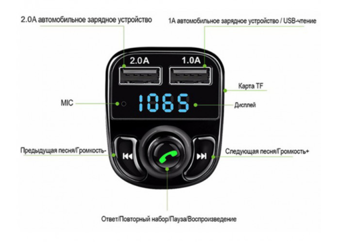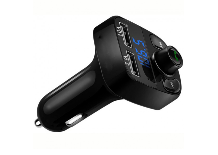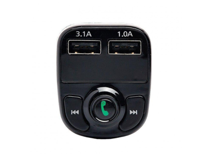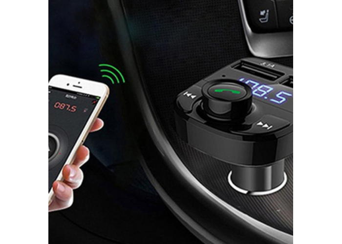Практично кожна машина укомплектована аудіосистемою, але не кожна може програвати MP3 файли, флешки або карти пам'ять. Тепер рішення є. Трансмітер для авто FM MP3 X8 призначений для відтворення музики з USB-накопичувачів, micro SD карт пам'яті и Bluetooth. Найпоширешим методом є передавання через Bluetooth, за допомогою якого можна відтворювати аудіо з телефонів, планшетів, ноутбуків. Працює такий пристрій від прикурювача. Трансмітер зроблений із чорного глянсового пластику. На панелі є дисплей, розміщена кнопочка посередині, яка може натискатися (наприклад, закінчити виклик), а також обертається по колу, регулюючи гучність. З боків від неї є дві кнопки для перемикання треків. Над ними розташована маленька точка — це чутливий мікрофон для гучного зв'язку. Зверху на пристрої є два USB-порти, за допомогою яких можна програвати треки з флешки або ж заряджати телефон та інші пристрою. Трансмітер підтримує безліч музичних форматів: MP3 / WMA / APE / FLAC / WAV. Він невеликого розміру, дуже компактний. Це чудова пропозиція за доступною ціною.