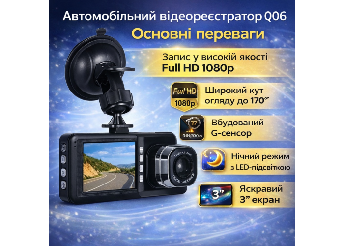 Автомобільний відеореєстратор Q06 — це надійний пристрій для фіксації дорожньої ситуації у високій якості. Модель обладнана якісним об'єктивом із кутом огляду 170 градусів і 4-шаровою скляною лінзою, що дає змогу захоплювати в кадр кілька смуг руху. Міцний корпус із цинкового сплаву захищає електроніку від перегрівання та пошкоджень. Великий 3-дюймовий екран зручний для перегляду відзнятого матеріалу прямо на місці.