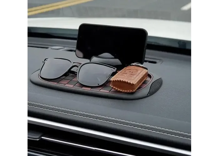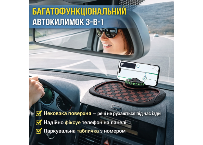 Многофункциональный автомобильный коврик 3-в-1 сочетает нескользящую поверхность, удобный держатель для смартфона и парковочную табличку с номером телефона. Устанавливается на панель без клея и магнитов, надежно фиксирует телефон в горизонтальном положении и предотвращает скольжение мелких предметов во время движения. Компактный, простой в использовании и улучшает комфорт в салоне, обеспечивая быстрый доступ к телефону и контактной информации.