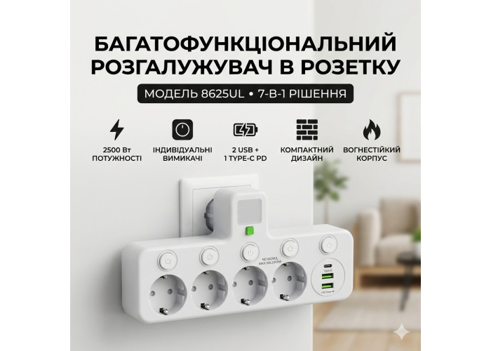 Мережевий адаптер 8625UL — це ідеальне рішення для тих, хто цінує порядок та функціональність. Пристрій дозволяє перетворити одну стандартну настінну розетку на потужну станцію для живлення та зарядки 7 пристроїв одночасно, не займаючи при цьому місця на підлозі чи столі зайвими дротами.