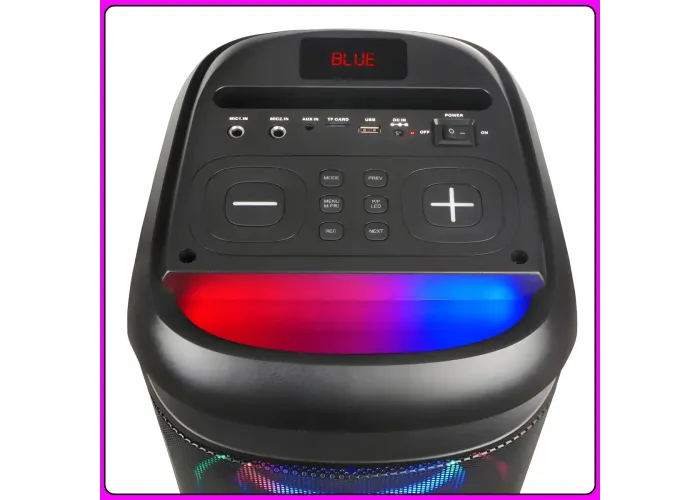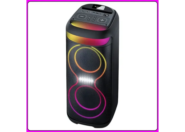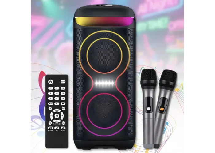 Акустична переносна колонка — це потужна портативна аудіосистема, призначена для відтворення музики зі смартфонів, планшетів та інших пристроїв через Bluetooth або дротове під'єднання AUX 3.5 мм. Колонка обладнана двома динаміками діаметром 6.5 дюйма, які забезпечують насичений і гучний звук. LED-підсвітка створює ефектний світловий супровід, що змінюється в такт музиці, що робить пристрій чудовим вибором для вечірок, виступів і різних заходів.
