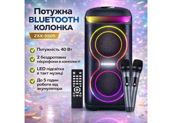 Портативна Bluetooth колонка 2х6.5" з 2 бездротовими мікрофонами та LED-підсвіткою ZXX-5505 40W