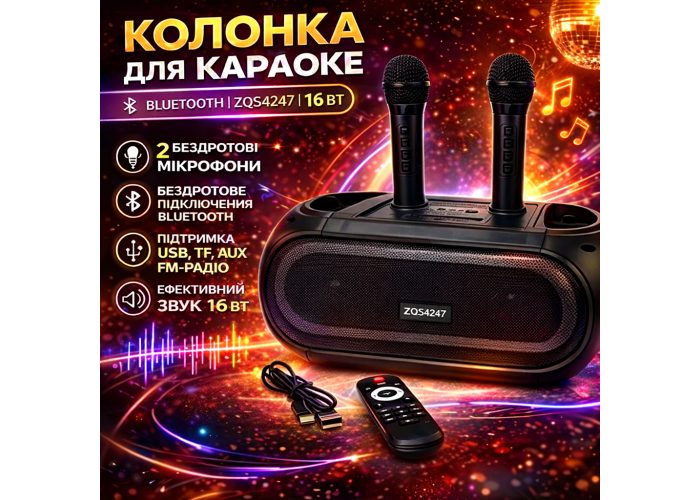 Портативна Bluetooth колонка ZQS4247 — це універсальне рішення для музики та розваг. Завдяки потужності 16 Вт і гучності до 85 дБ вона забезпечує чистий та насичений звук як у приміщенні, так і на відкритому повітрі.