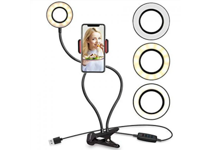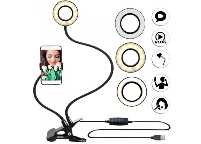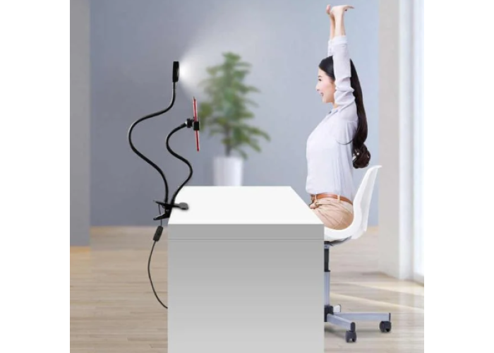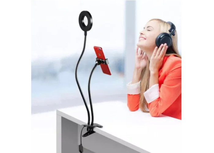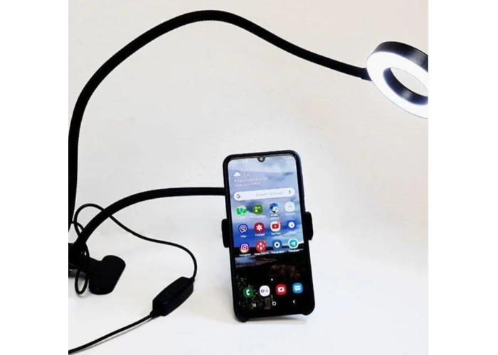 Найзручніший тримач для телефона з підсвіткою для того, кому соціальні мережі приносять прибуток і популярність, компактна гнучка лампа з тримачем для телефона не тільки освітить знімання, а й звільнить руки від телефона, а універсальна прищіпка дасть можливість встановити кільцеве світло де завгодно.