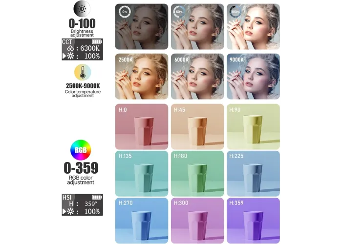 Широкий діапазон колірної температури: Від 2500K до 9000K — від теплого до холодного світла під будь-яку атмосферу знімання.