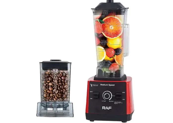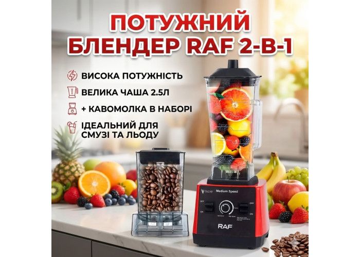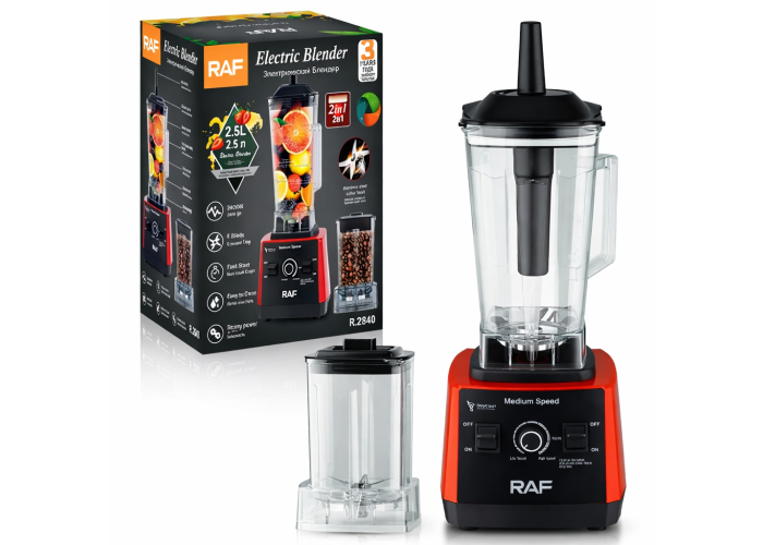 Опис Потужний стаціонарний блендер RAF R.2840 — це універсальне рішення для кухні, що об'єднує функції подрібнювача, міксера та кавомолки. Завдяки двигуну потужністю 2400 Вт і системі із 6 лез із неіржавкої сталі, пристрій легко справляється з твердими продуктами, льодом, горіхами та кавовими зернами. Містка скляна чаша об'ємом 2.5 літра дає змогу готувати великі порції смузі, коктейлів або супів-пюре для всієї родини. Механічне керування з 15 швидкостями забезпечує точний контроль над процесом подрібнення.