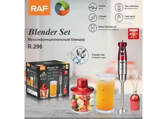 RAF 296 — це потужний і функціональний блендер, який швидко й ефективно допоможе отримати потрібну консистенцію оброблюваних продуктів і стане надійним помічником на кухні. Блендер чудово підходить для подрібнення, збивання, змішування, приготування пюре.