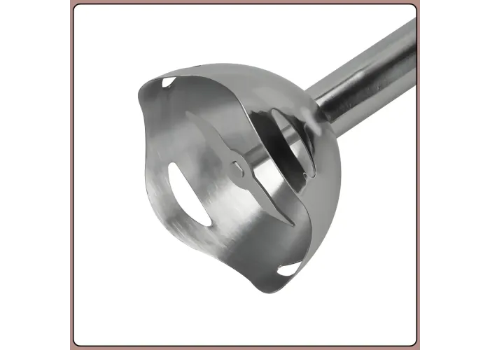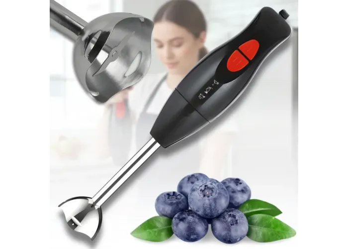 Блендер обладнаний пластиковим наконечником із ножами з неіржавкої сталі і знімним валом, що полегшує його очищення та догляд. Ергономічна ручка забезпечує комфортне утримання приладу навіть вологими руками, а зручне розташування кнопки керування дає змогу легко змінювати швидкості під час роботи. Насадка легко знімається й миється, водночас усі деталі, крім моторного блока, можна мити в посудомийній машині.