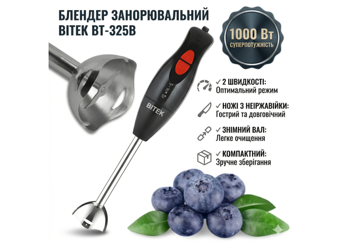Ручний блендер на 2 скорости з ножами з неіржавкої сталі BITEK BT-325B 1000W