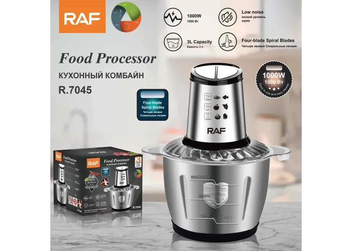 Кухонний комбайн RAF R.7045 — це універсальний помічник на кухні, який допоможе швидко та легко справлятися з різноманітними кулінарними завданнями. Завдяки потужному мотору та багатофункціональним насадкам прилад ідеально підходить для нарізання, подрібнення, збивання та змішування інгредієнтів.