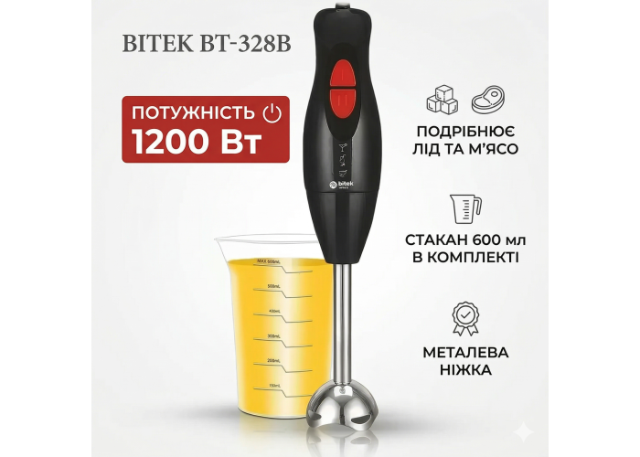 Заглибний ручний блендер для кухні з чашею на 600 мл BITEK BT-328B Чорний1200W Блендер з металевою ніжкою