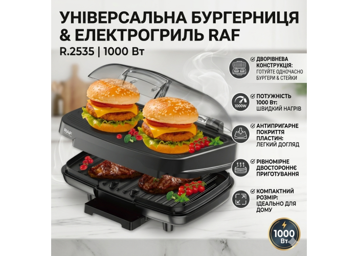 Електрична бургерниця з двостороннім нагріванням і антипригарними пластинами RAF R.2535 1000W
