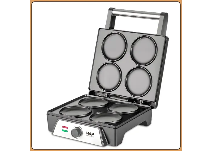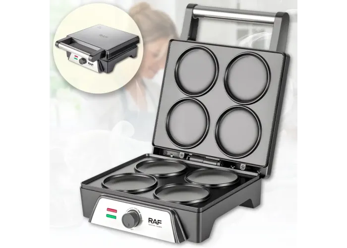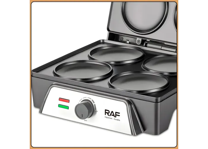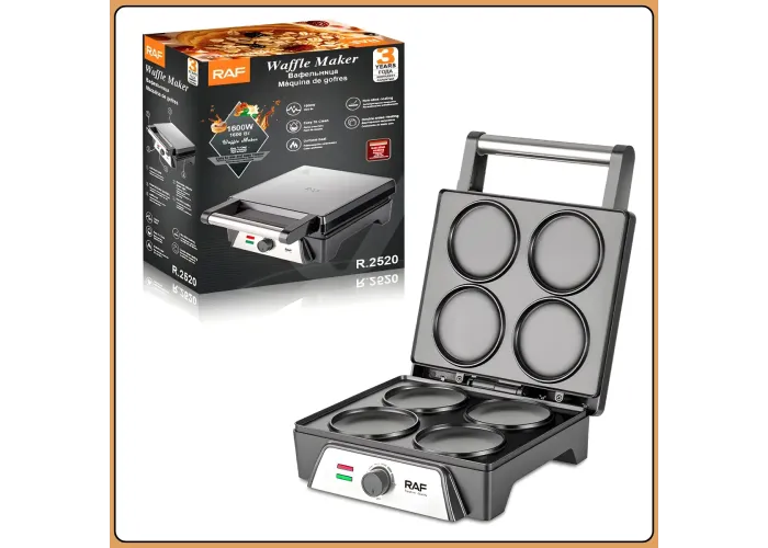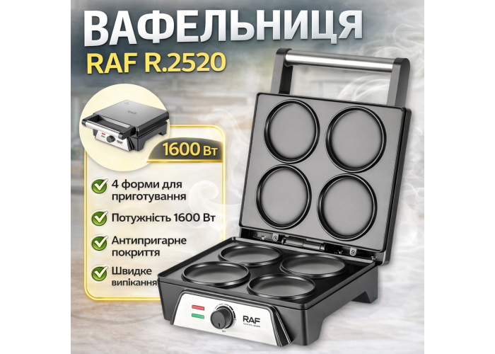Вафельниця RAF R.2520 призначена для зручного та швидкого приготування панкейків, оладок і мафінів у домашніх умовах. Потужність 1600 Вт забезпечує швидке нагрівання та стабільну робочу температуру, а двостороння система нагрівання дає змогу рівномірно пропікати вироби з обох боків. Прилад обладнаний формами на чотири кола, що дає можливість готувати кілька порцій одночасно та заощаджувати час.