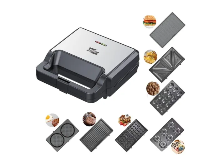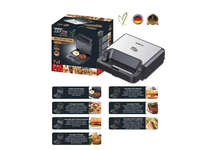 Сендвічниця мультимейкер 7в1 2200 Вт Zepline ZP-811 — це універсальний і практичний кухонний пристрій, що дає змогу готувати різноманітні сендвічі вдома. Завдяки своїй багатофункційності він стає невіддільним помічником під час приготування сніданку, обіду або вечері. Сендвічниця обладнана 7 змінними пластинами, що дають змогу приготувати не тільки смачні та апетитні гриль-сендвічі, а й інші страви, як-от омлет, вафлі, млинці та навіть стейки. Наявність індикаторів живлення й готовності дає змогу використовувати мультимейкер зручним і точно визначити момент початку приготування й готовності пристрою до використання.