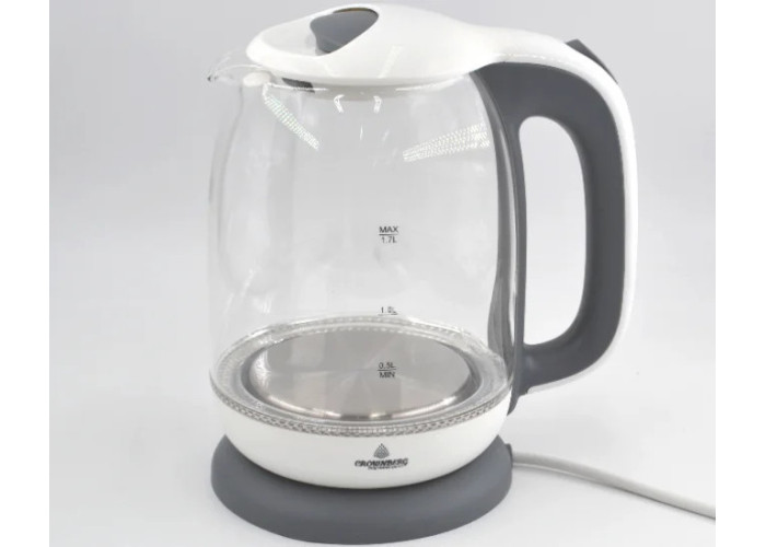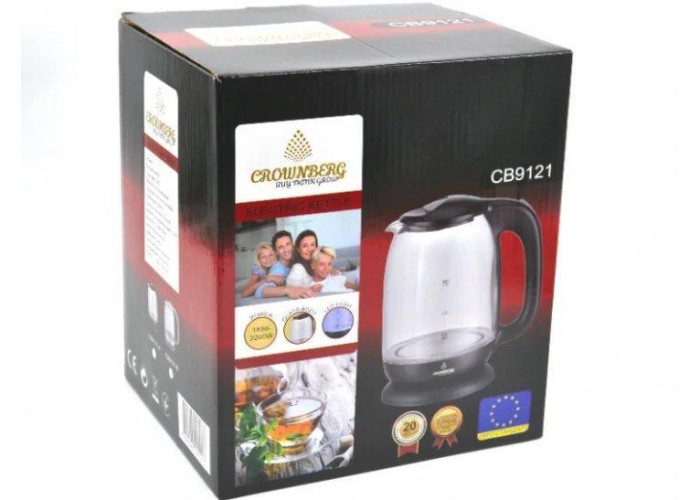 Чайник Crownberg CB 9121 являє собою електрочайник об'ємом 1.7 л, цього цілком вистачить для приготування чаю для всієї родини та гостей. Щоб не обпекти руки об ручку чайника, виробники зробили її з пластику, цей матеріал не нагрівається в процесі роботи пристрою. Класичний сучасний електричний чайник поєднує в собі стильний дизайн, швидке нагрівання та доступну вартість. Колба електрочайника виготовлена з жароміцного скла та забезпечена вбудованою підсвіткою. Прихований дисковий нагрівальний елемент підвищує швидкість закипання води та знижує утворення накипу. Електрочайник високої якості з нешкідливих матеріалів, що не мають різкого запаху, — запорука приємного та безпечного чаювання в колі сім'ї та друзів.