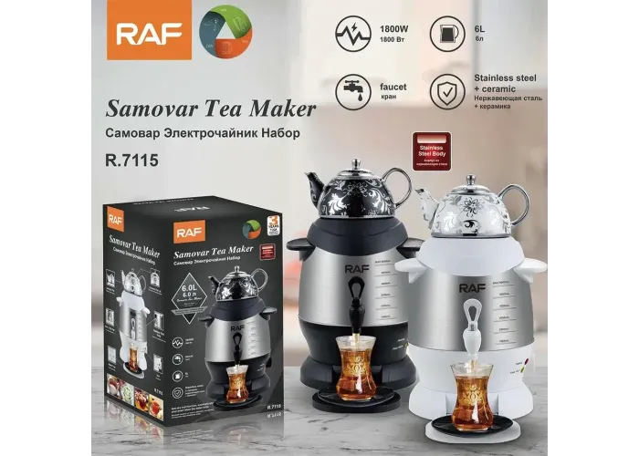 Наш Електричний самовар 2 в 1 з порцеляновим чайником RAF R.7115 — якщо щастя-гарячий ковток чаю, зустрінете свою нову щасливу станцію. З легким у чистоті інфузором із неіржавкої сталі та протитепловими ручками для безпеки та швидкого наливання самовар — це фантазія кожного шанувальника чаю.