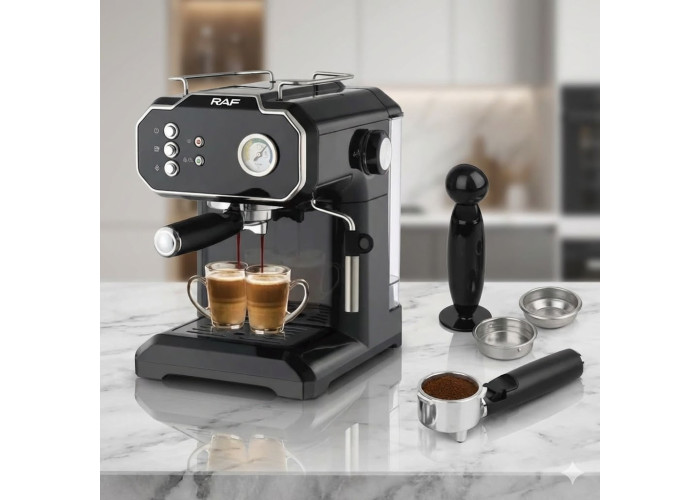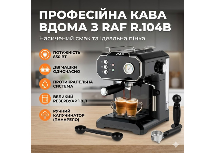Опис Кавоварка RAF R.104B — це функціональний і стильний пристрій для справжніх цінувальників ароматної кави. Модель належить до крапельного типу та призначена для використання з меленою кавою. Завдяки високій потужності 850 Вт, напій готується швидко, зберігаючи насичений смак і аромат. Місткий резервуар для води об'ємом 1.8 літра дає змогу приготувати каву відразу для всієї родини або великого колективу без потреби постійного доливання води. Прилад обладнаний протикрапальною системою, яка запобігає проливанню рідини, якщо ви вирішите налити чашку кави до завершення повного циклу заварювання. Короткий чорний корпус із міцного пластику та металу гармонійно впишеться в інтер'єр будь-якої сучасної кухні.