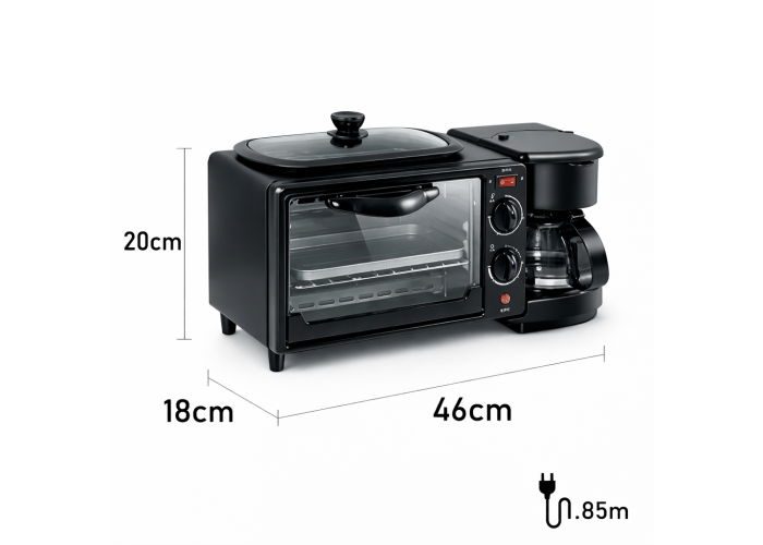 Електрична мінідуховка ATLANFA AT-301 — це компактний багатофункціональний кухонний прилад формату 3 в 1, який поєднує в собі електричну духовку, вбудовану кавоварку та гриль-сковороду. Пристрій призначений для повсякденного приготування їжі та напоїв в умовах обмеженого простору.