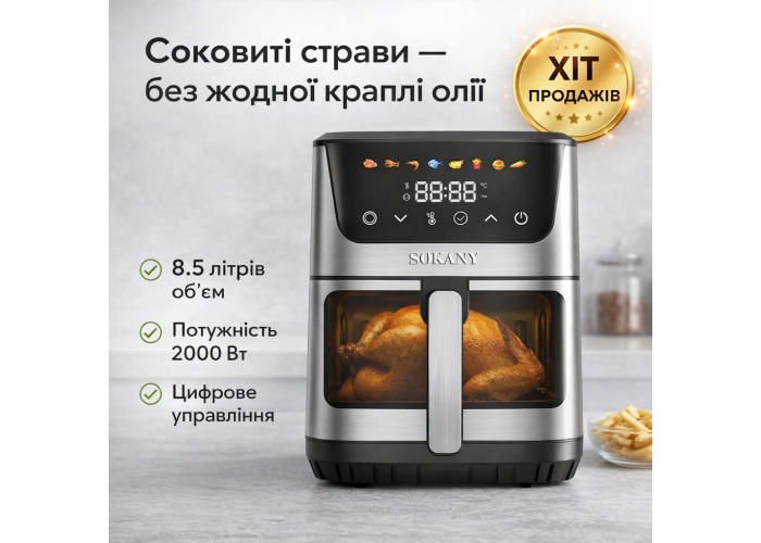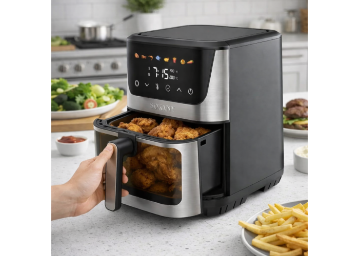 Аерофритюрниця SK-10107 — це ваш персональний шеф-кухар, який перетворює звичні продукти на корисні шедеври. Інноваційна система конвекції гарячого повітря створює апетитну хрустку скоринку, зберігаючи соковитість і всі вітаміни всередині продуктів. Завдяки набору вбудованих програм і зрозумілій панелі керування, ви зможете ідеально приготувати будь-яку страву — від картоплі фрі до соковитого м'яса — всього за кілька торкань.