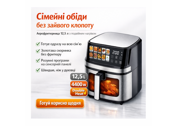 Широкий цифровий дисплей з іконками страв і сенсорними кнопками дає змогу одним дотиком вибрати програму, відрегулювати температуру та час. Переглядове вікно допомагає контролювати процес приготування, не відкриваючи камеру та не втрачаючи тепла. Це сучасна альтернатива духовці для швидкого та корисного домашнього меню.