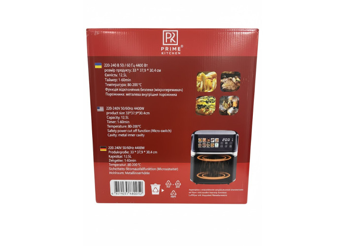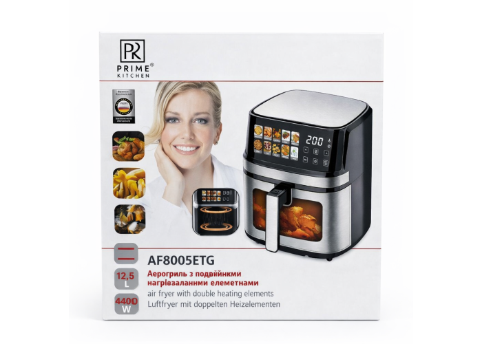 Stylish аерогриль Prime Kitchen AF8005ETG — це потужна аерофритюрниця зі збільшеним об'ємом 12,5 літрів і подвійними нагрівальними елементами зверху та знизу. Завдяки циркуляції гарячого повітря ви готуєте хрусткі страви з мінімальною кількістю олії, зберігаючи натуральний смак і соковитість продуктів.