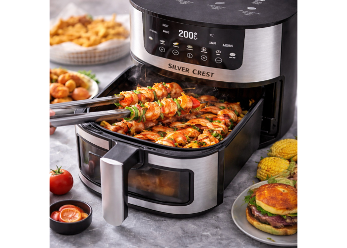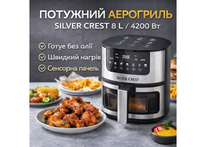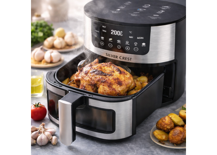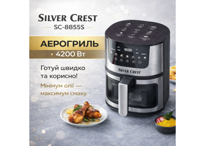 Потужний аерогриль Silver Crest SC-8855S об'ємом 8 літрів — ідеальне рішення для великої родини або компанії. Готуйте смачні та корисні страви з мінімальною кількістю олії завдяки технології Hot Air (гаряче повітря циркулює рівномірно та швидко просмажує продукти).Корпус із неіржавкої сталі та чорного скла має стильний та сучасний вигляд. Великий сенсорний дисплей із яскравим підсвічуванням і зрозумілими іконками, зручне керування кнопками + і -, таймер до 60 хвилин, температура від 80 до 200 °C. Все керування на українському (іконки інтуїтивні).