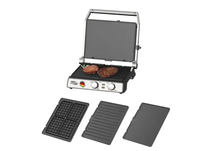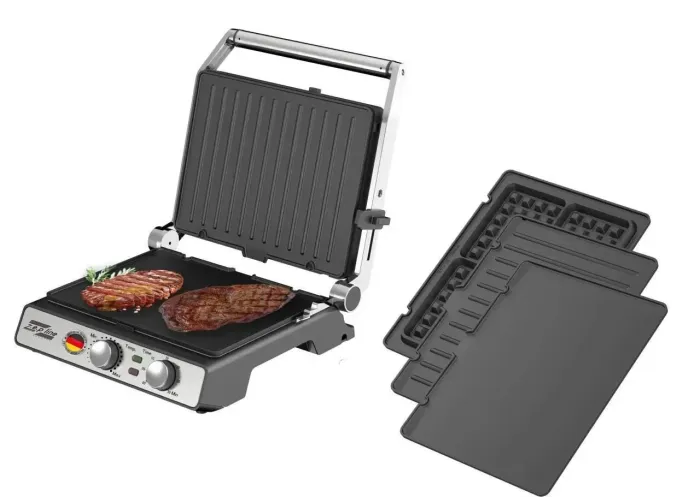 Панелі пристрою покриті антипригарним матеріалом, стійким до подряпин і перегрівання. До комплекту входять три змінні насадки: для гриля, для вафель і плоска панель, що робить його універсальним кухонним помічником.