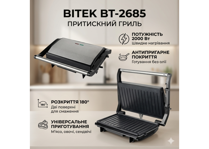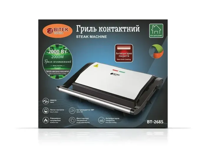 Притискний гриль з антипригарним покриттям BITEK BT-2685 2000W Електричний контактний гриль