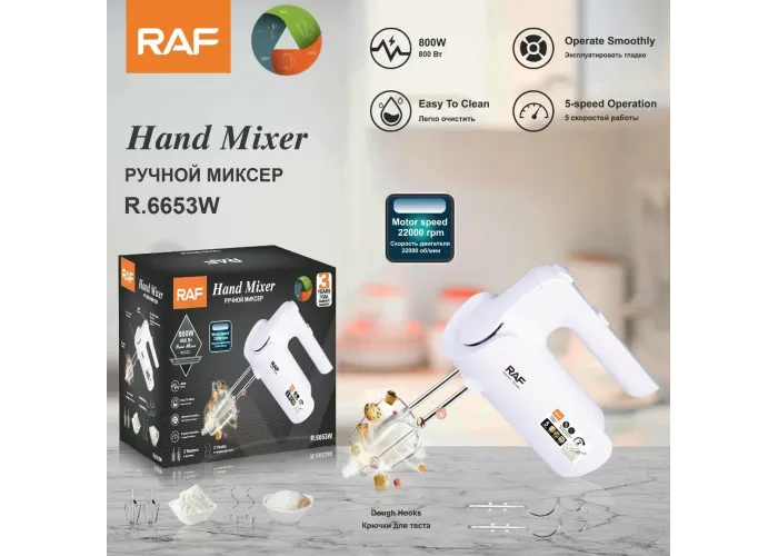 Електричний ручний міксер RAF R.6653 — це зручний і надійний помічник для прихильників домашньої випічки. Обладнаний потужним двигуном на 800 Вт, він легко справляється з різними завданнями: від змішування рідких інгредієнтів до замішування тіста.