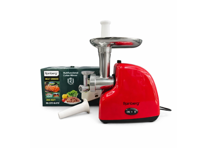 Електрична м'ясорубка Rainberg RB-2319 призначена для приготування фаршу з м'яса, риби, грибів і перероблення овочів у домашніх умовах. Потужність 3000 Вт забезпечує стабільну роботу зі щільними продуктами та рівномірне перероблення. Продуктивність до 1 кг на хвилину дає змогу швидко справлятися з повсякденними завданнями на кухні. Корпус виготовлений із міцного пластику з елементами з неіржавкої сталі. Функція реверсу спрощує очищення шнека під час застрягання продуктів. Захист від перевантаження підвищує безпеку експлуатації та продовжує термін експлуатації пристрою.