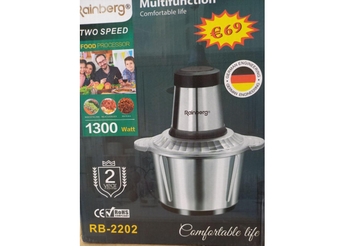Презентація продукту: Електрична м'ясорубка, 1300 Вт, чаша з надтовстого скла 2 л, 4 леза з неіржавкої сталі, блендер, м'ясорубка, овочерізка, 2 швидкості