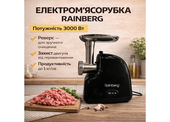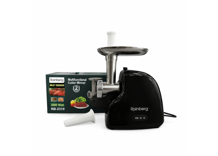 М'ясорубка Rainberg RB-2319 використовується для перероблення м'яса та інших продуктів у домашніх умовах. Потужність 3000 Вт дає змогу ефективно працювати зі щільними інгредієнтами. Продуктивність до 1 кг фаршу за хвилину підходить для регулярного використання. Модель обладнана функцією реверсу для усунення застряглих продуктів і системою захисту від перевантаження. Корпус виготовлений із міцного пластику з металевими елементами, стійкими до зношування.