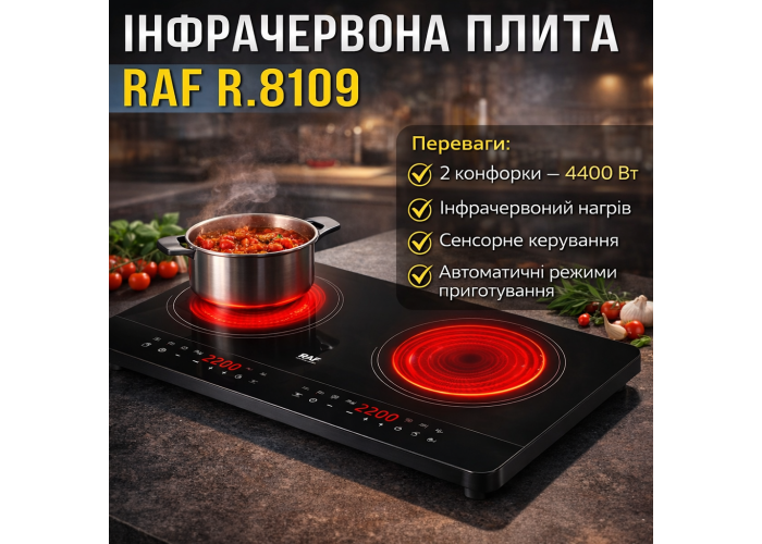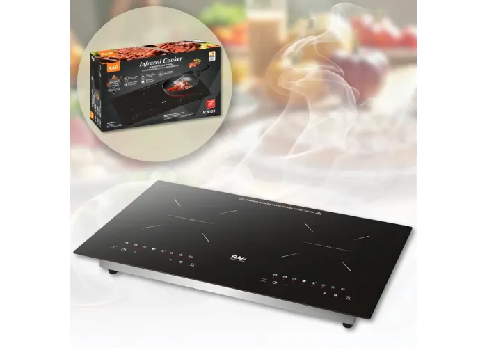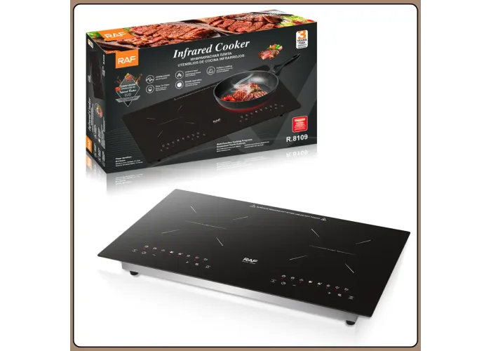 Інфрачервона плита RAF R.8109 призначена для комфортного й ефективного приготування різних страв у домашніх умовах. Дві конфорки потужністю по 2200 Вт забезпечують швидке розігрівання і стабільну роботу, а інфрачервона технологія нагрівання сприяє рівномірному розподілу тепла по всій поверхні посуду. Плита підходить для варіння, смаження, тушкування та інших способів приготування без втрати якості страв.