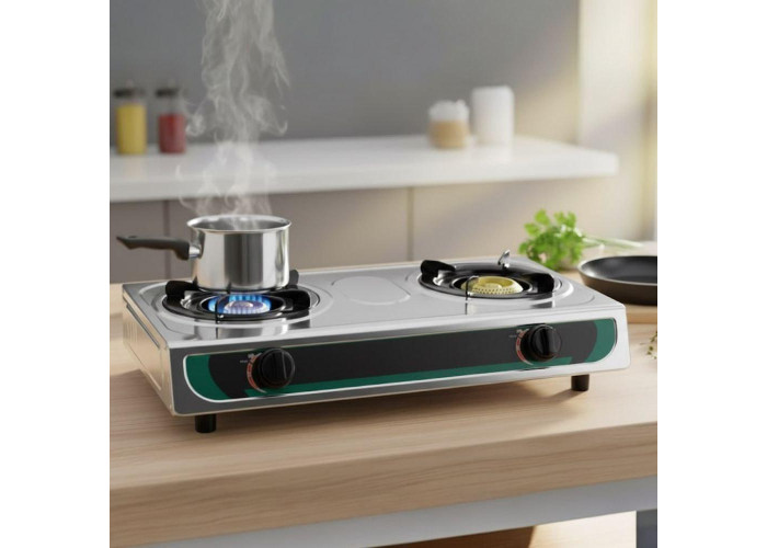 Плита обладнана двома конфорками і працює на зрідженому газі (пропан/бутан) від газового балона. Її міцний металевий корпус з емальованою поверхнею не тільки забезпечує довговічність, але й легко очищається від забруднень.