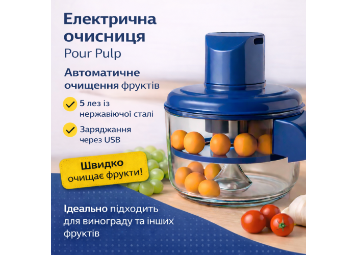 Електрична очищувачка Pour Pulp — це зручний кухонний пристрій для швидкого та акуратного очищення винограду й інших фруктів від шкірки.