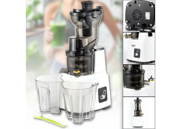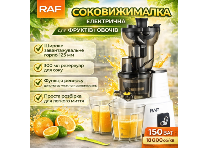 Соковижималка RAF R.2705 призначена для швидкого та зручного приготування свіжих соків в домашніх умовах. Потужність 150 Вт і продумана конструкція забезпечують ефективне перероблення фруктів, овочів і зелені за низького рівня шуму. Широкий завантажувальний отвір 125 мм дає змогу завантажувати цілі плоди без попереднього нарізання, що неабияк заощаджує час підготовки.