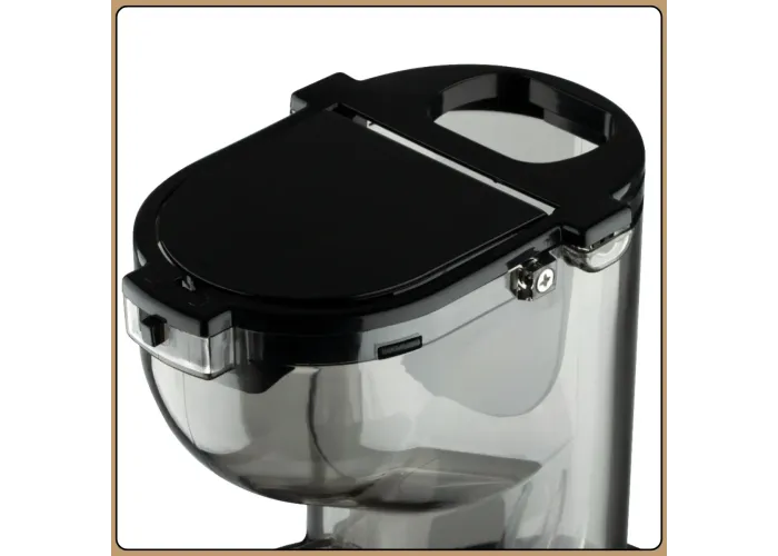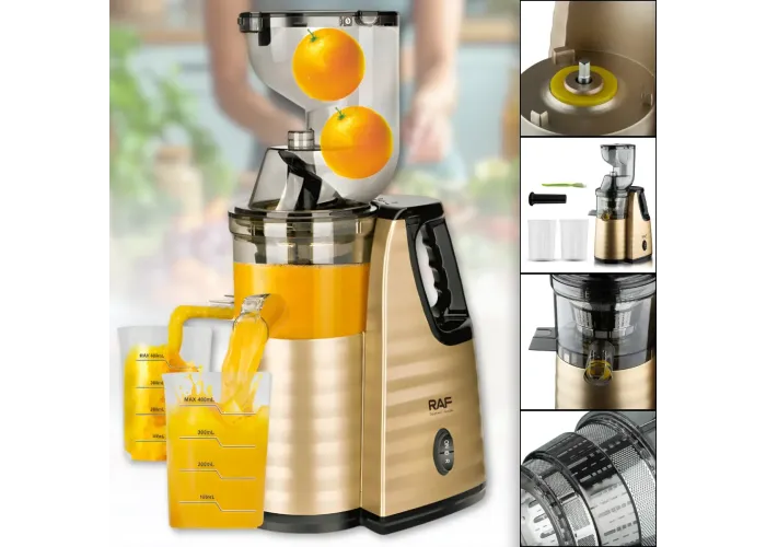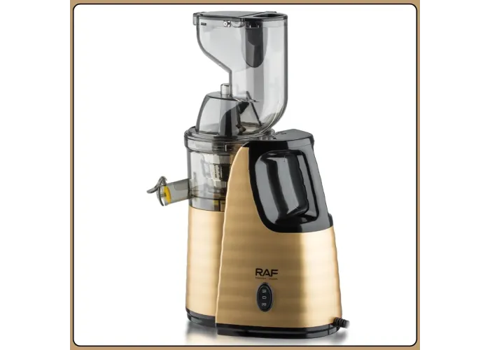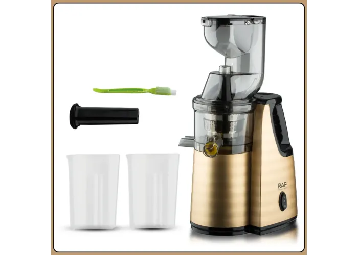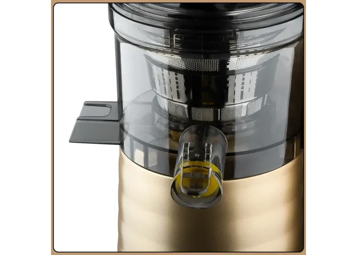 Модель обладнана двигуном постійного струму з чистої міді, , який вирізняється стабільною роботою та низьким рівнем шуму. Фільтр із неіржавкої сталі забезпечує чистий сік без зайвої м'якоті, а функція реверсу допомагає уникнути зам'ят під час роботи. Прогумовані ніжки гарантують стійкість на поверхні, а стильний золотистий корпус гармонійно вписується в інтер'єр кухні.