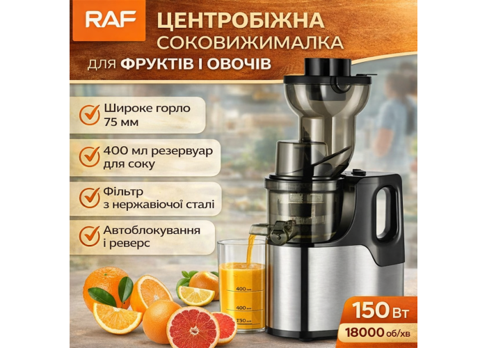 Соковичавниця RAF R.2857 — це зручний і сучасний пристрій, який дасть змогу швидко й без зайвих зусиль приготувати свіжий натуральний сік. Завдяки відцентровій технології та потужному мотору на 150 Вт, прилад ефективно витягує сік із фруктів і овочів, зберігаючи максимум вітамінів і корисних речовин.